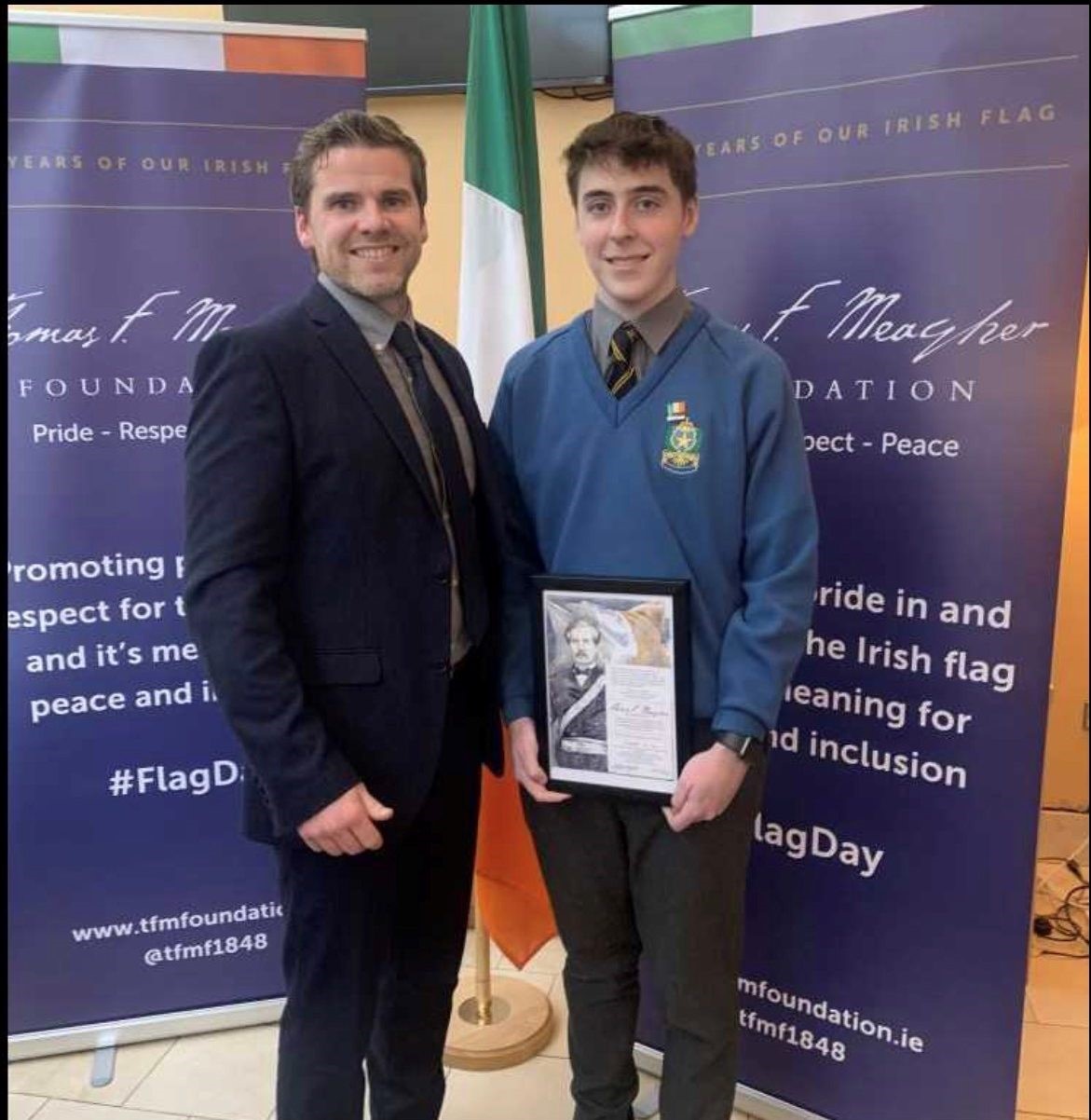 Congratulations to De La Salle 5th Year student Robert Keenan on winning ‘Best Essay’ at the Thomas F. Meagher Foundation Awards. Robert, his family and Cian Ó Náraigh were in attendance in Leinster House for the Awards Lunch, where Robert received his certificate. The Foundation promotes pride and respect for the Irish flag in celebrating a new and more inclusive Ireland. Congratulations Robert!
